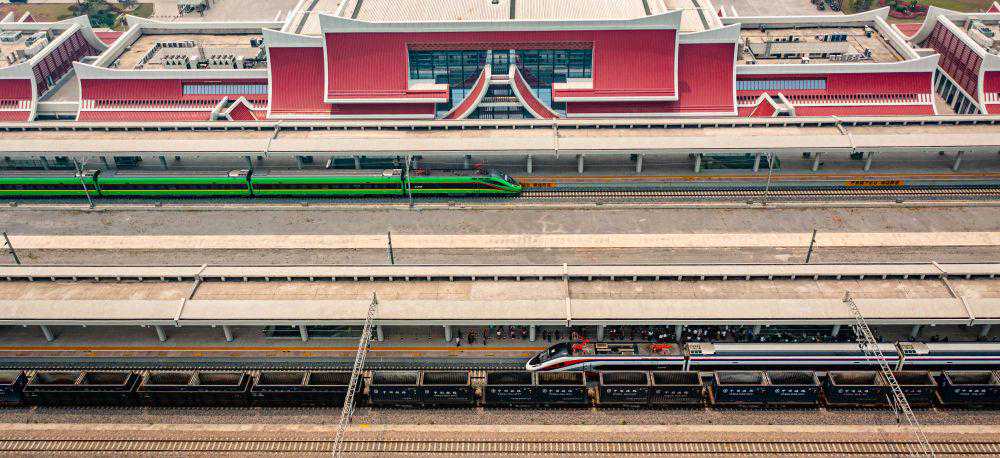 4月13日,“复兴号”(上)、“澜沧号”动车组列车停靠在中老铁路磨憨站(无人机照片)。新华社记者胡超摄