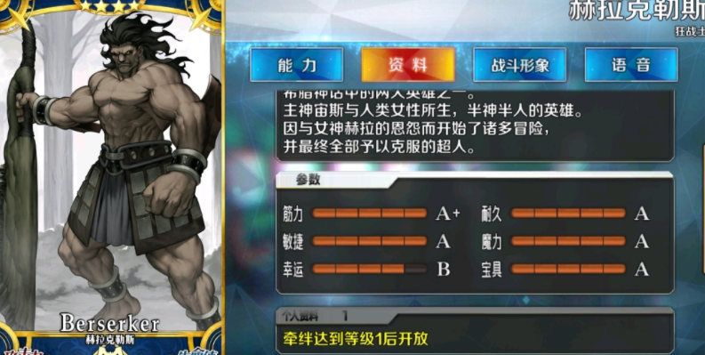 大力神海叔,这个面板设计上很经典,除了幸运这一块的数值是B,有点缺口之外,其他的数值有四项都是A,其中筋力更是A+级别的,综合数值设计上还是相当平衡的,你别海叔这么大块头,人家实际上是真正的几乎没死角的优秀从者。