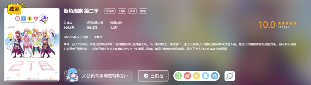 时隔三年,今年4月本作动画第二季开播!开播初期是B站唯一一部曾经拿到过10.0满分的新番!后来一直稳定在9.9分!