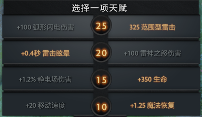 融化变体精灵,恐怖利刃这样的敏核几乎就在一瞬之间。并且雷击眩晕可以被雷云继承,再加上25级有AOE雷击的天赋,所以20级这里推荐+0.4s雷击眩晕。