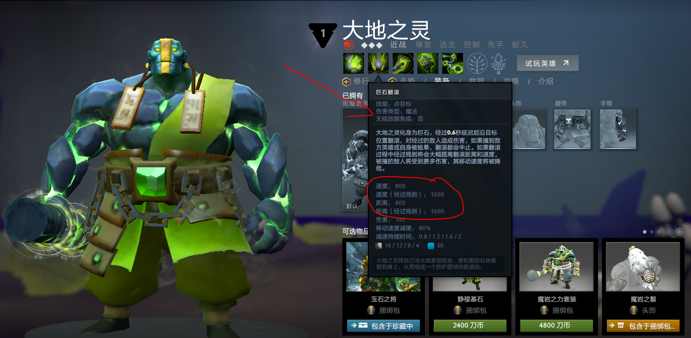 二技能:巨石翻滚。(可以看到,这个技能在使用时,原始的速度与距离是800,经过残岩之后,速度与距离达到1600,也就是翻了一倍。
