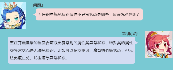 刚背兽分析:五庄星爆开启当回合新增属性类免疫引发玩家各种猜想,官方一看给出的范围太广今天立马改口圈点范围,只能免疫嘲讽、魔音等效果。