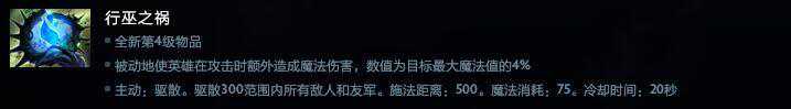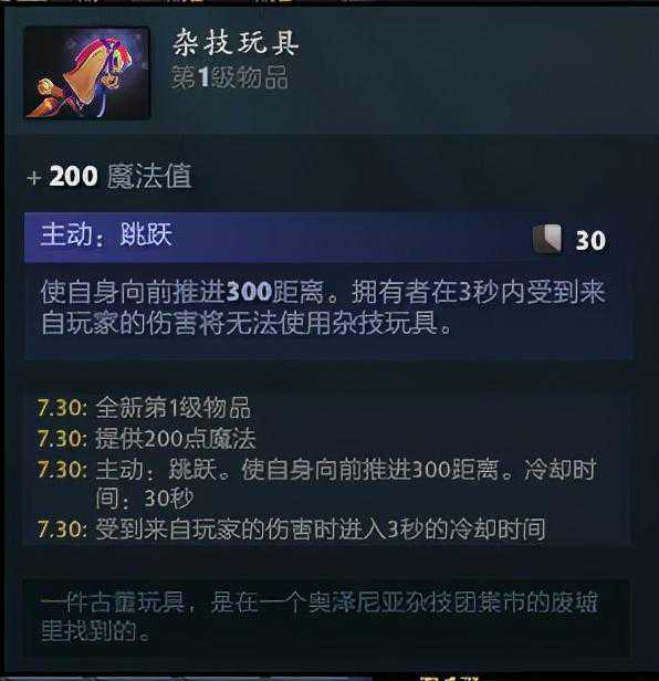 杂技玩具,大部分情况都可以当成暗淡胸针的弱化版。只加魔法上限没有任何其他效果,虽然有一个主动技能但冷却30秒过久且效果也很鸡肋,属于没什么能拿的情况下凑合用一下。但对于小小、撼地者等前期魔法上限很低的辅助来说还算OK。