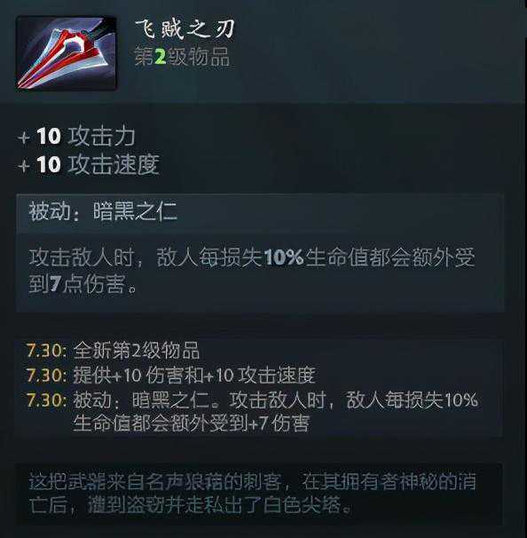 飞贼之刃所提供的10点伤害和10点攻击力乍一看虽然不强,但其实它的被动效果却大有玄机。被动效果是敌人每损失百分之10生命都会额外受到7点伤害,打满血敌人可能确实不痛不痒,但该被动效果可以叠加,也就是敌人损失生命值越多我们加的攻击力越高,最多可以附加7*9也就是63点攻击力,不容小觑。而且该效果对中立生物和小兵也适用,打钱效率会有明显增加。