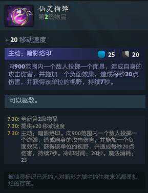 仙灵榴弹,可以简单理解为赏金猎人的标记和影之灵龛的结合体。补伤害外加获得对手视野,再也不怕敌人绕树林卡阴影,中规中矩的二级中立物品。提供视野的效果对于像风暴之灵、冥界亚龙这种杀人非常需要依靠普攻的英雄来说很关键。