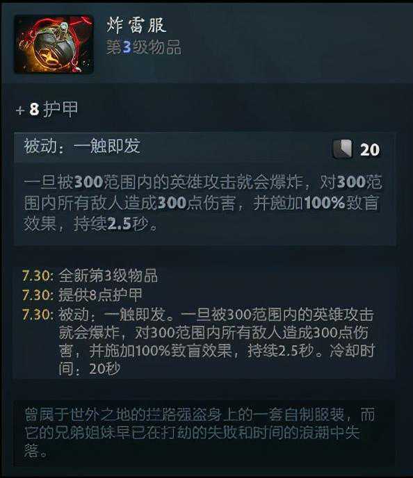 炸雷服,可以简单当成带技能的板甲。加8护甲只比板甲少了2点,但却多了一个伤害+百分百致盲效果的被动。
