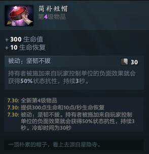 简朴短帽,亮点主要在于被动效果所提供的3秒百分之50的状态抗性,可以化解大多数情况下的先手控制。但当团战中对手有意识的用廉价的技能去破被动的时候这件道具就显得很一般了。比如影之灵龛就可以轻易触发该被动,或者否决坠饰的驱散效果也可以驱散将其掉。当你使用幻影刺客、斯温这种需要黑皇杖切入却总是被对手无视魔免的控制(如兽王大)针对的情况下非常好用。