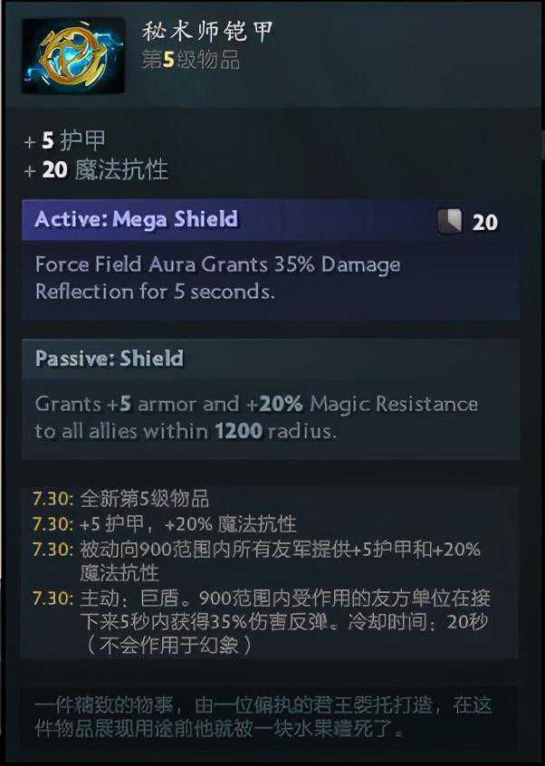 另外经过测试,该主动效果是开启后有一个持续5秒的范围性反弹光环,而不是释放时给附近单位施加反伤buff。总得来说面对对手大量的法系爆发时这件物品是朴实无华的强,但如果对手阵容大部分是物理输出的话这件装备的强度可能就要大打折扣了。
