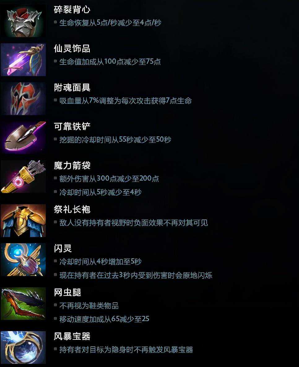 其中值得一提的是幻术师披风的删除对于部分英雄影响还是很大的,而其他中立物品虽然被移除但影响较小并且基本都有新的中立物品作为替代品。
