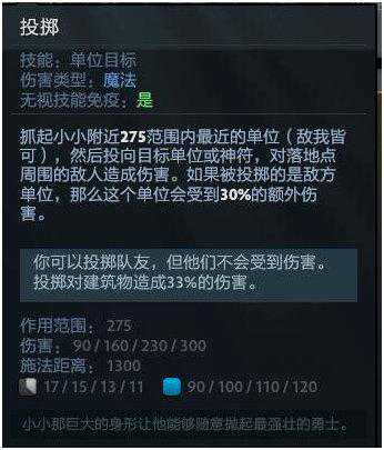 二技能投掷,一级便拥有1300码的投掷距离,和很多英雄都能够配合,比如人马、神牛、大鱼。在对线期,可以让队友站在塔下或者等己方兵线到达塔下时,将对手投掷回来。比如对手选出电棍,在己方兵线到达塔下时,你就可以假装走位失误,给他抽攻,趁机把他丢回塔下,用山崩和人物模型卡位来消耗甚至是击杀对手。在队友被集火时,可以用投掷来救队友。
