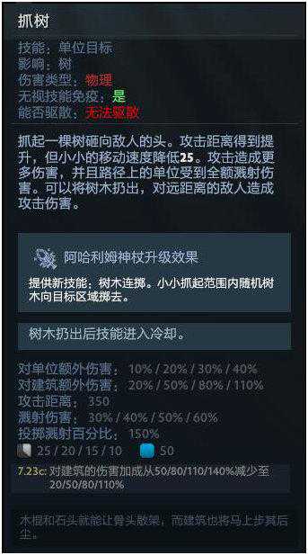 一技能山崩,在上个大版本经过修改后,虽然增加了控制时间,但是能够在山崩期间开出BKB了,这个技能在前期学一级干扰对手补刀即可,抓树满级之后再补满一技能。