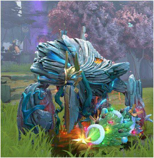 值得一提的是,这次的迎霜节珍藏中,额外奖励的小小冰霜巨岩套装中的圣诞树可以和ti9小本子中的声望套装来混搭使用。